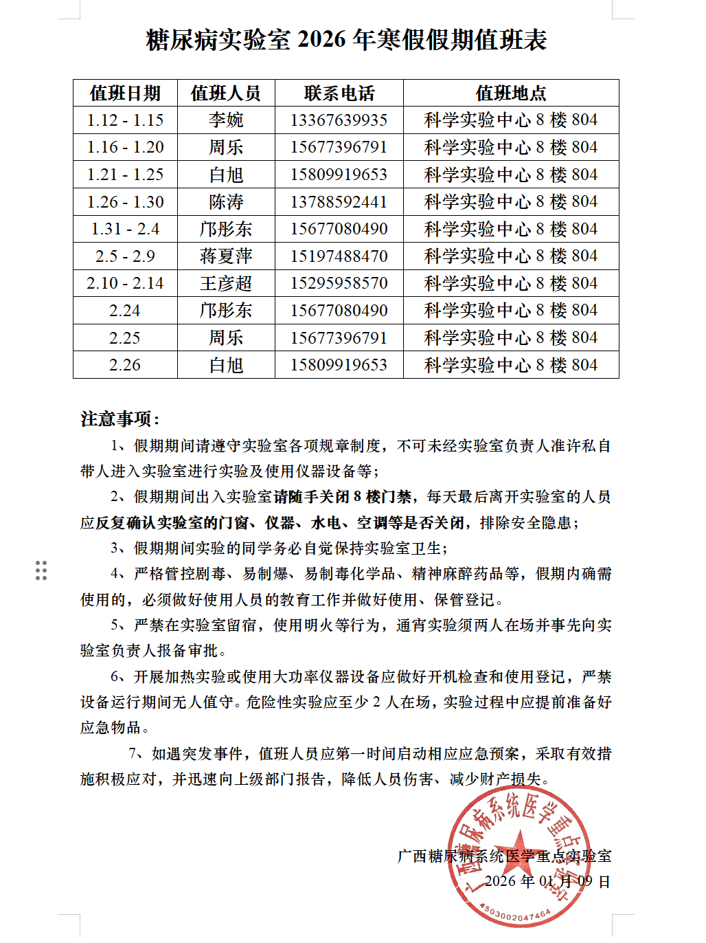 广西糖尿病系统医学重点实验室2026年寒假值班表