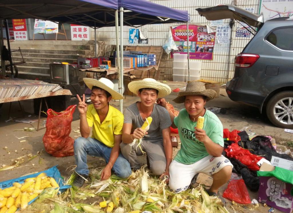 俸锦迪(右一)与村民们一起在武宣街头推销甜玉米