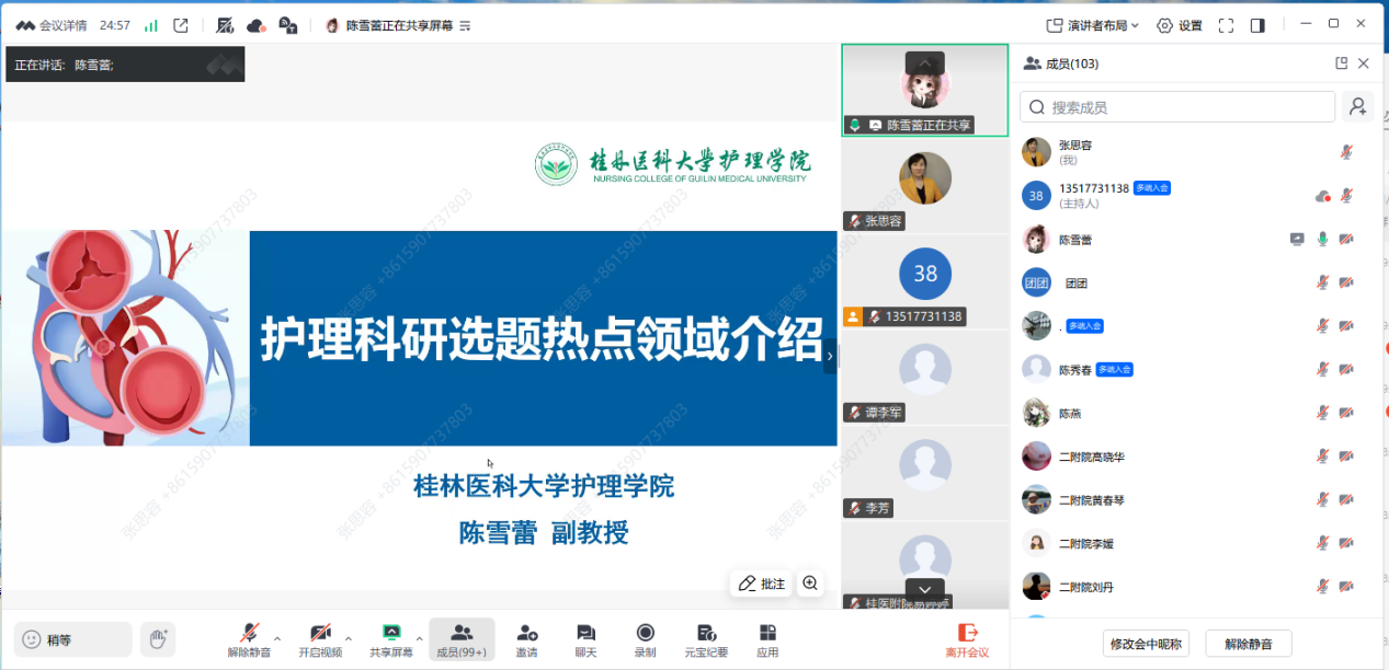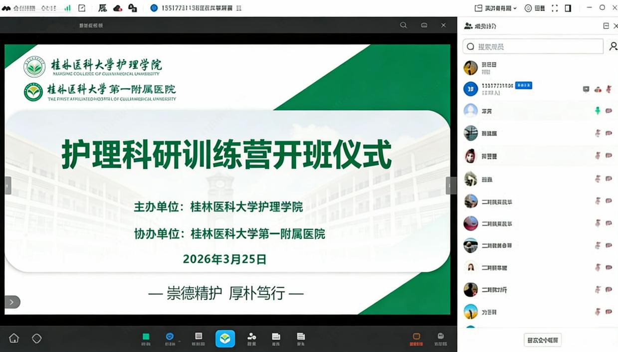 3月25日晚,由桂林医科大学护理学院主办、第一附属医院协办的首期护理科研训练营开班仪式以线上形式顺利举行。来自护理学院,直属第一附属医院、第二附属医院的160余名教师、临床护理工作者积极参加。仪式由护理学院副院长陈雪蕾主持。