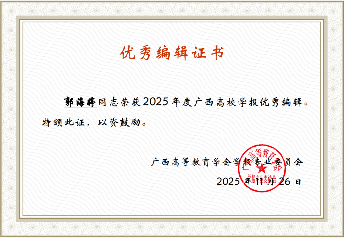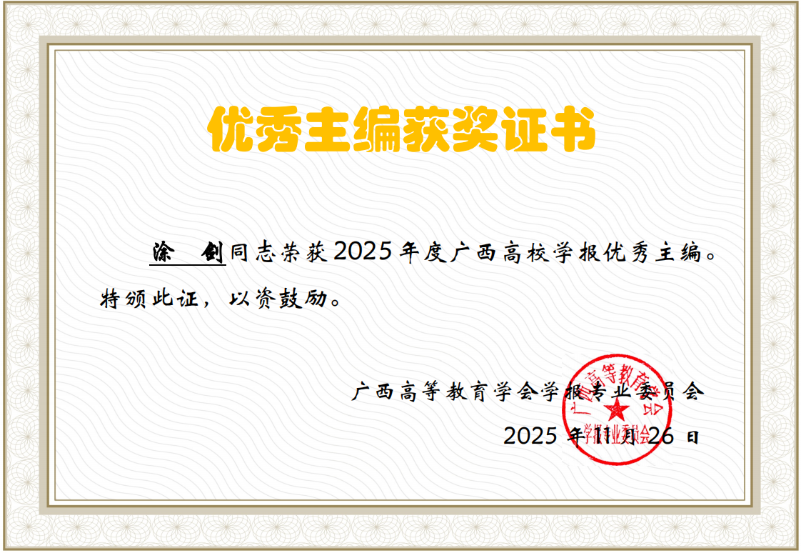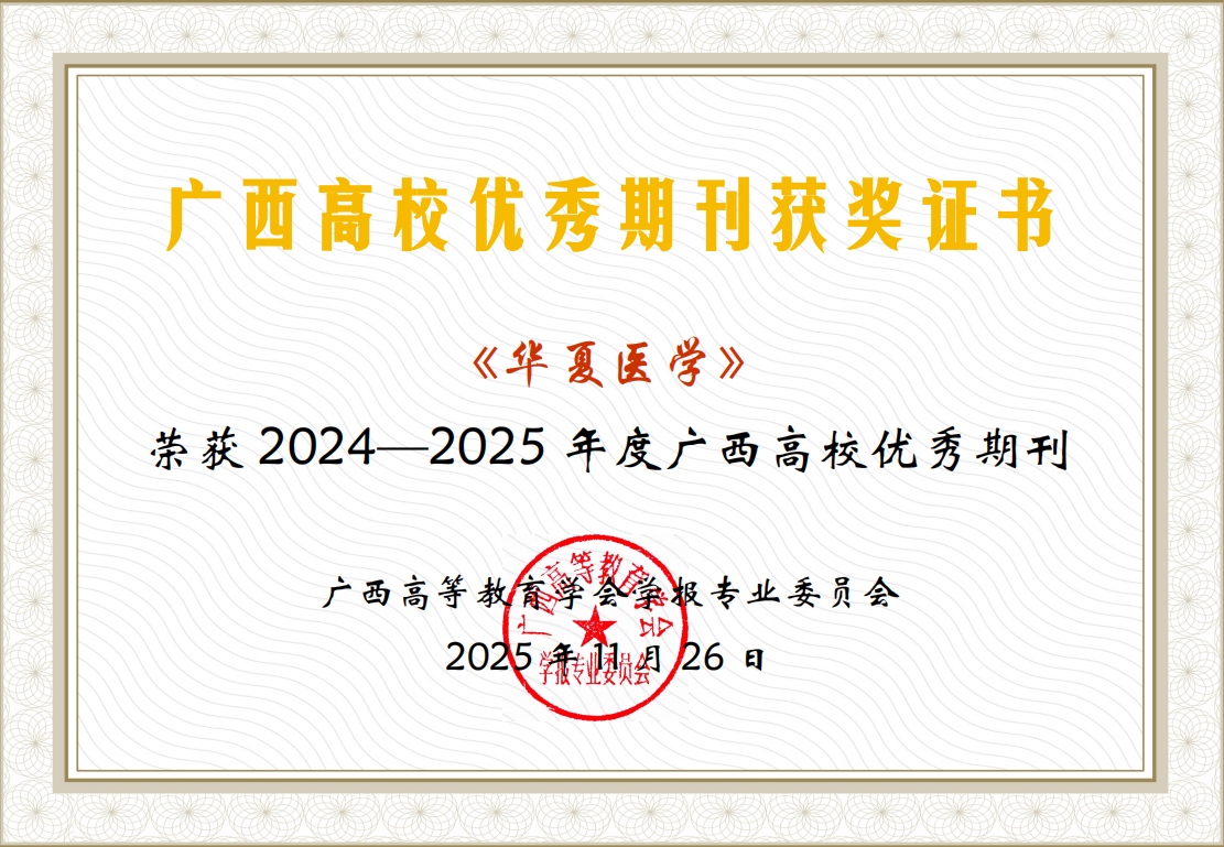 广西高等教育学会学报专业委员会主办的“2025年度广西高校学报学术研讨会”于2025年11月25日-29日在崇左市举行。会上,“2025年广西高校学报评优表彰大会”隆重举行,经过专家评审组的初审、复审以及领导小组的严格审核,《华夏医学》荣获“2024-2025年度广西高校优秀期刊”。同时,涂剑获“广西高校学报优秀主编”,杨建香、郭海婷均获“广西高校学报优秀编辑”。