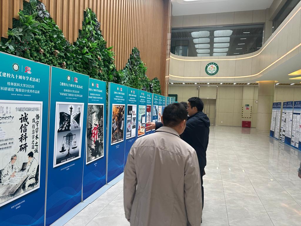 为充分展示大赛成果,科学技术研究院于11月6日至22日在临桂校区科学实验中心一楼大厅对优秀获奖作品进行了集中展览。展览期间,吸引了大量师生驻足观看,成为一堂生动的、可视化的科研诚信教育公开课,引发了观展者的广泛共鸣与深入思考。