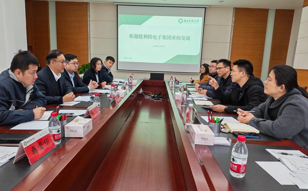 1月30日上午,优利特电子集团常务副总裁唐雪辉一行到访我校,双方在临桂校区明德楼举行产学研合作交流座谈会。科学技术研究院常务副院长、科技处处长马礼兵主持会议。