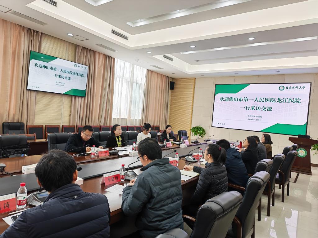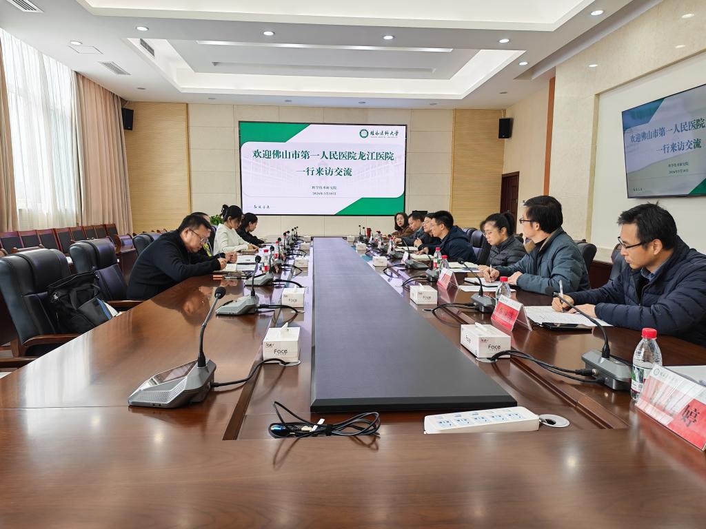 3月10日上午,佛山市第一人民医院龙江医院党委副书记、院长肖长华带队到访我校临桂校区,双方围绕平台共建、教学协同、人才培养、科研合作与成果转化等事宜开展座谈交流,共商校院协作发展新路径。座谈会在明德楼502会议室举行,科学技术研究院常务副院长、科学技术处处长马礼兵主持,科学技术研究院、教务部、研究生院等相关部门负责人出席座谈。