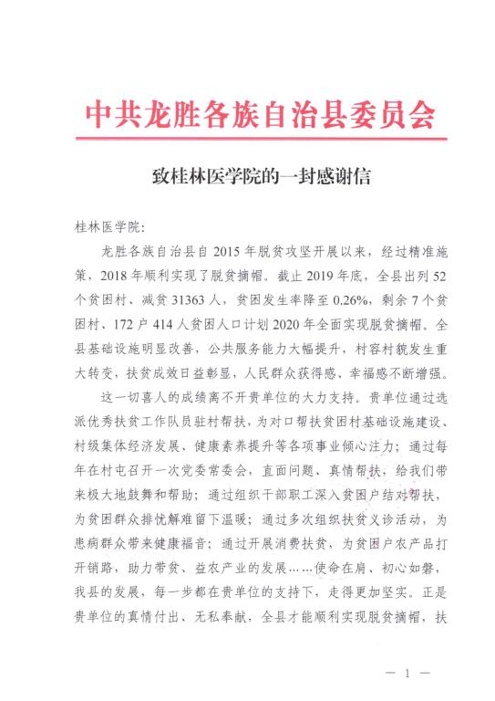 近日,学校收到一封来自龙胜各族自治县委员会、人民政府的感谢信,代表17万龙胜各族人民,感谢桂林医学院真情付出、大力帮扶龙胜县脱贫攻坚事业,有效助力龙胜各族人民顺利实现脱贫摘帽,字里行间饱含赞誉和感激之情。这封感谢信也充分体现了学校的脱贫攻坚工作成效,得到了龙胜县党委政府的高度评价和肯定。