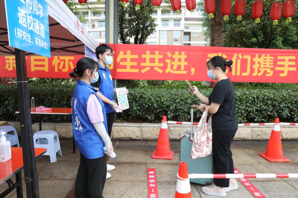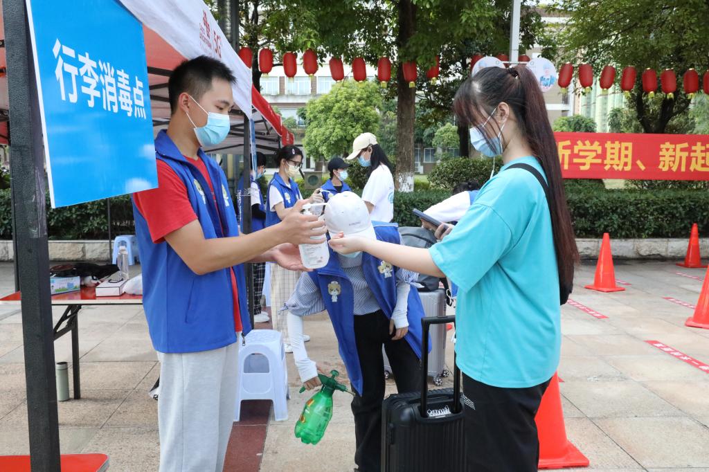 返校当天,临桂校区统一由东大门进入,开设六个区内返校同学通道,两个外省同学返校的专用通道。工作人员对学生进行体温检测并查看健康码,核验审批回执及相关证件,并对行李进行卫生消杀,体温低于37.3℃,健康码绿色或者金色方可正常进入校园。学生返校后14天内,非必要不外出,临时外出必须辅导员审批。各班级返校后要严格执行“易班体温上报”“缺课缺勤上报”和“体温异常上报”制度。