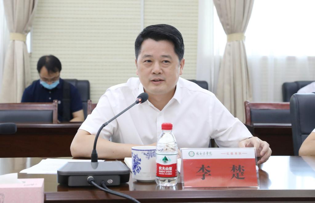 李楚认真听取了汇报,充分肯定了我校取得的成绩。他指出,学校致力打造的高水平康养医美特色,高度契合桂林世界级旅游城市发展战略,前景广阔、大有可为。他表示,桂林市委、市政府高度重视教育和医疗工作,将一如既往地全力支持桂林医学院的发展。他希望学校继续发挥人才、技术、教育、医疗资源优势,加强校地、校企合作,促进科技成果转移转化,为桂林经济社会发展提供更有力的支撑。
