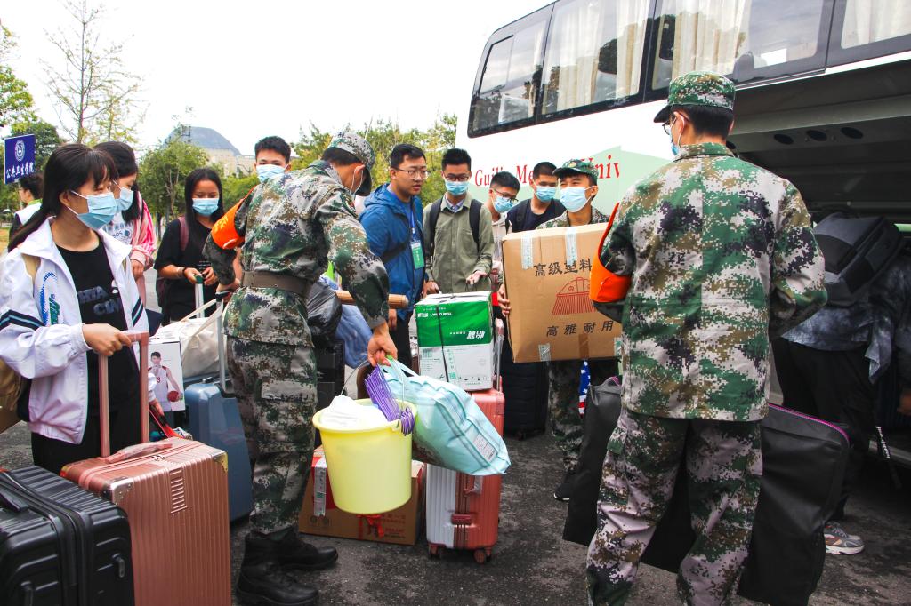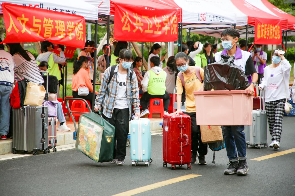 “请提前扫码,填报个人信息”“请在这边排队,检测体温”……按照学校的统一部署,各院系和职能部门安排了志愿者及交通车到飞机场、火车站、汽车站迎接新生。在迎新点和各院系接待站也有志愿者积极为新生服务,承担着人员指引、疏导人流、行李搬运、协助查验证件、体温检测等工作。在众多学生志愿者当中,由我校退役学生组成的“桂医尖兵”志愿者团队尤为突出,迎新现场到处都能看见他们军人般的矫健身影。为了方便学生行李的运送,学校还安排了摆渡车不停地来回穿梭,学校护卫队员在现场开展安全保卫、后勤保障等服务,为迎新安全“保驾护航”。