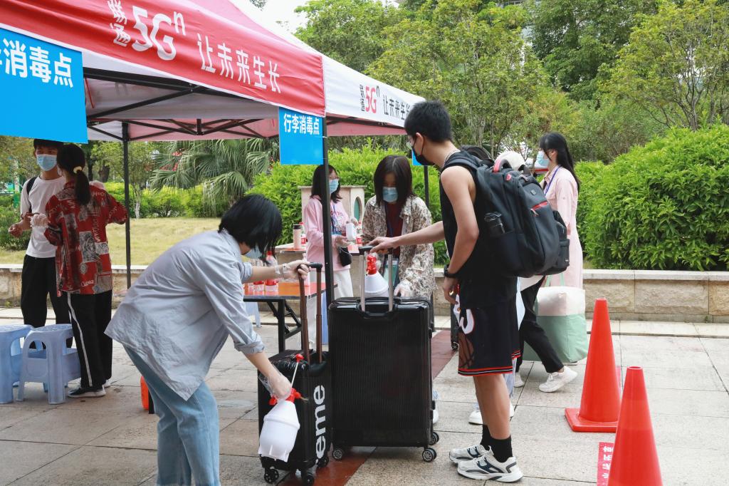 当天清晨,临桂校区东门,6条新生通道依次排开。工作人员在入口处对新生行李进行消毒,新生经过身份核验、体温检测、绿码通行等环节即可进入排队区等候校内摆渡车或步行前往学生公寓。根据疫情防控工作要求,学校对广西区外的新生,除了在入校前需提供48小时核酸阴性报告,入校后还统一安排第二次核酸检测。新生入校后14天,校园实行相对封闭管理,坚持“非必要不外出”“非必要不聚集”,学生外出实行申请审批制,出入校园应配合做好审核、测温等工作。