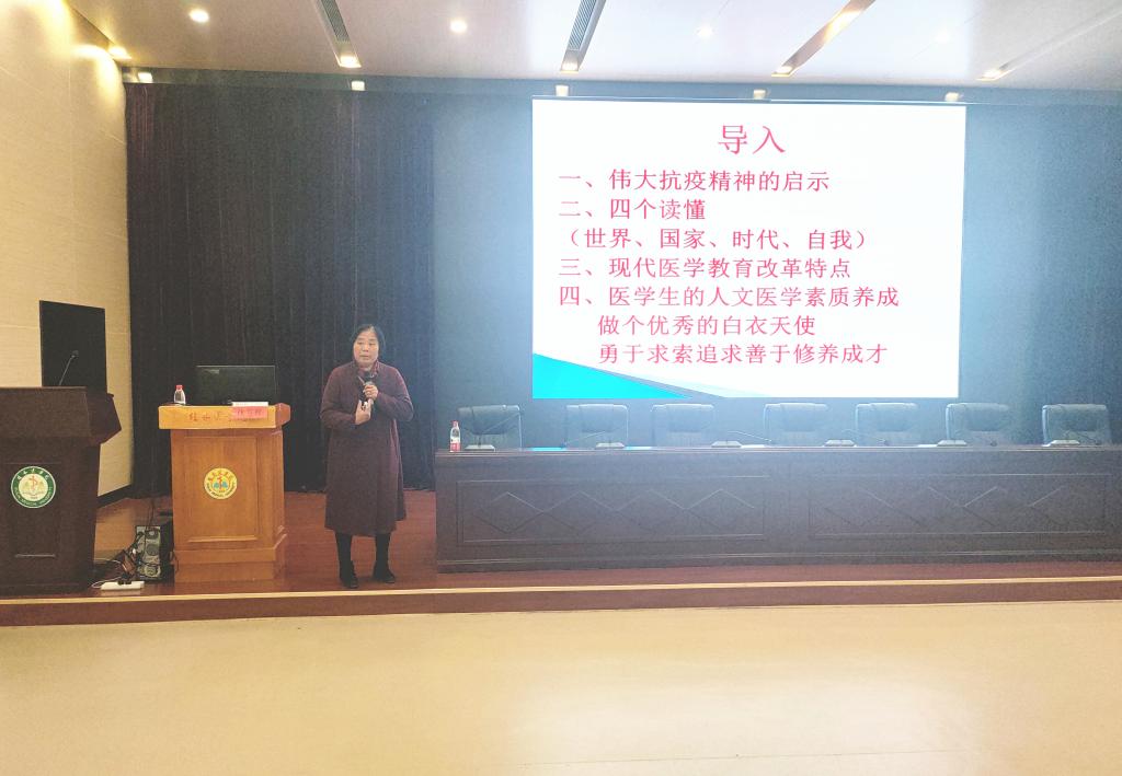 沈雪松结合自己的研究生在武汉抗疫的经历,回顾在党的坚强领导下举国上下众志成城、共同抗疫的历程,讲述抗疫斗争中彰显的制度优势和伟大抗疫精神,阐述医学生应具备的职业精神和人文素养,寄语同学们把个人的理想追求融入党和国家事业中,做一名有悟性、有理性、有灵性的医药工作者,为祖国医药卫生事业的发展和人类身心健康奋斗。沈雪松老师精心准备、旁征博引、层层深入、声情并茂地与学生交流探讨医学生的人文素质养成,将大爱与担当深入学生心田。现场掌声不断,大家备受鼓舞。