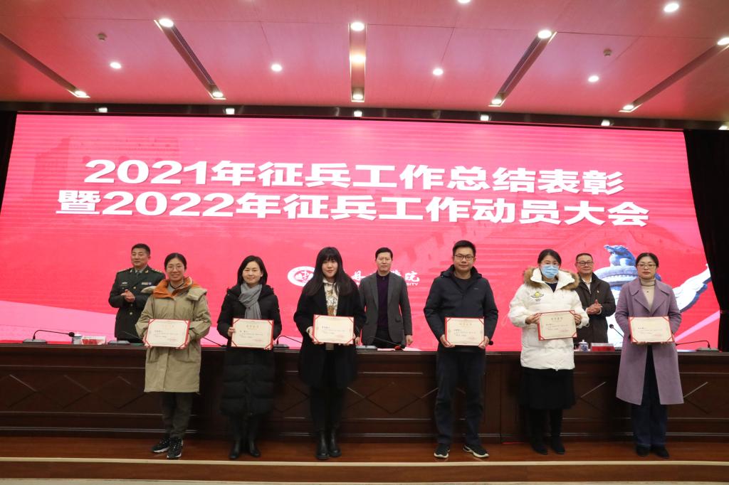 辛懋宣读了《关于表彰桂林医学院2021年度征兵工作先进集体、优秀征兵专员和先进征兵个人的决定》,8个单位荣获征兵工作“先进集体”,29名同志获“先进个人”。2021年我校“双合格”征兵任务完成率连续两年超过100%。