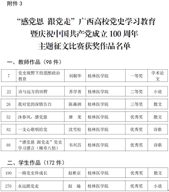 近日,自治区党委教育工委、自治区教育厅公布了“感党恩 跟党走”广西教育系统党史学习教育暨庆祝中国共产党成立100周年系列活动入选参展及获奖名单,我校师生参赛作品在主题征文比赛中获得多项荣誉,其中,一等奖1项、二等奖1项、三等奖1项、优秀奖5项。