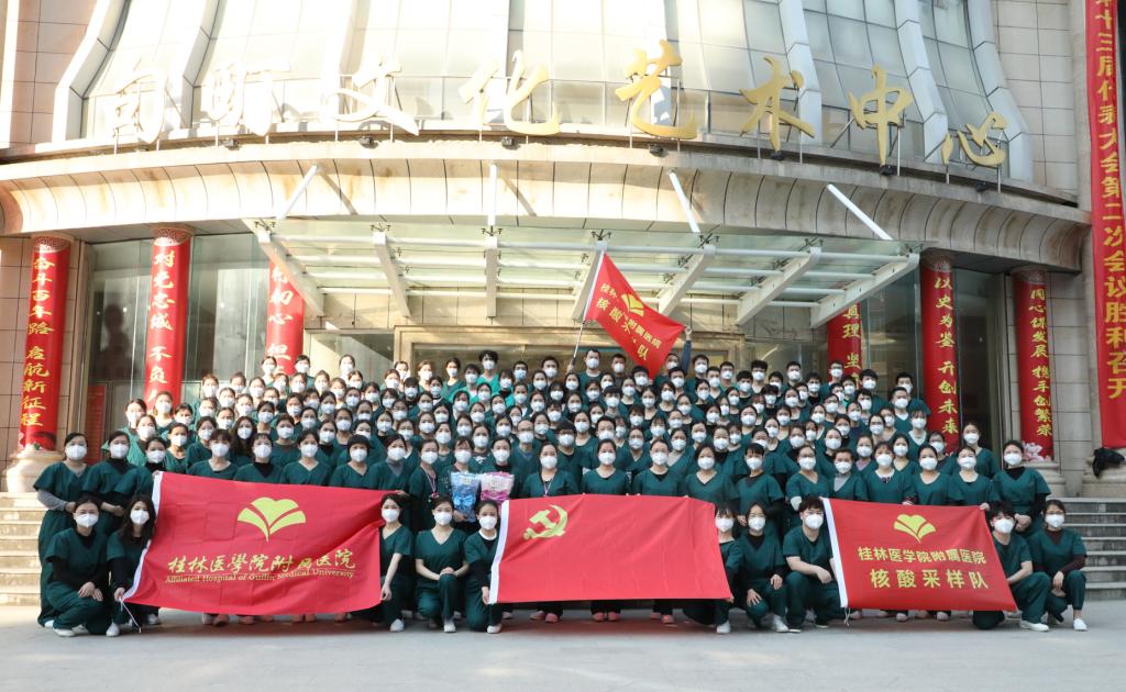附属医院、第二附属医院分别于2月6日、8日、10日选派了大批医护人员组成核酸采样队和医疗救治队支援百色市抗疫,五支队伍分别进驻靖西市、右江民族医学院附属医院百东院区(百色市临时应急医院)、西林县、田东县祥周镇。这些医疗队员里有参加过武汉抗疫的医护人员,有一同上阵的“夫妻档”,还有丈夫外出学习、留下不满5岁小孩交给父母的“女战士”……医疗队员们无惧风雨、迎难而上,给百色人民带来健康、带来安心。