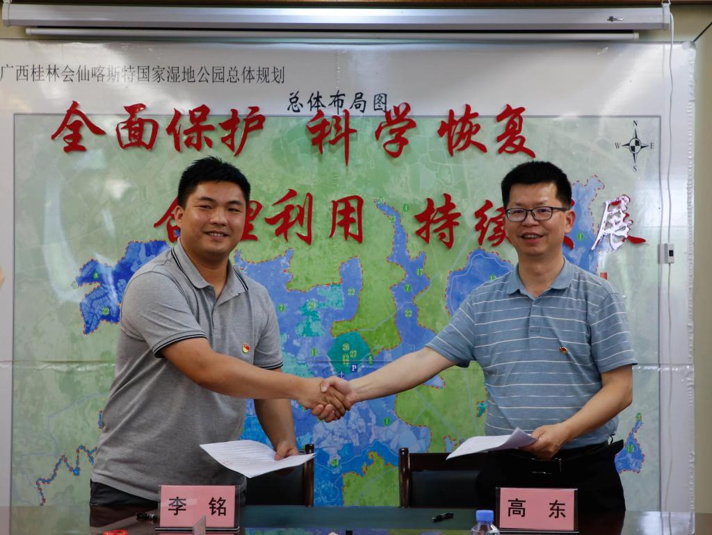 仪式上,双方代表签订“共建生态环境保护实践教育基地合作协议”。我校绿色学校创建工作领导小组办公室主任首先简要介绍学校基本情况,并向会仙国家湿地公园保护中心为我校生态环境保护教育实践工作的大力支持表示感谢。同时指出将生态保护区作为以高校为单位的实践教育基地,对于高校生态文明建设及环境保护教育都具有重要的示范意义。希望以此次共建为契机,进一步贯彻落实习近平生态文明思想,深入开展环境保护育人工作,未来双方应进一步深化交流,加强合作。搭建双方相互协作的创新科研平台,充分发挥生态环境与教学科研的协作作用,建立生态环境人才培养的新基地,打造生态环境保护事业发展的新平台。
