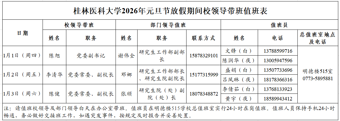 附件:桂林医科大学2026年元旦节放假期间值班安排表