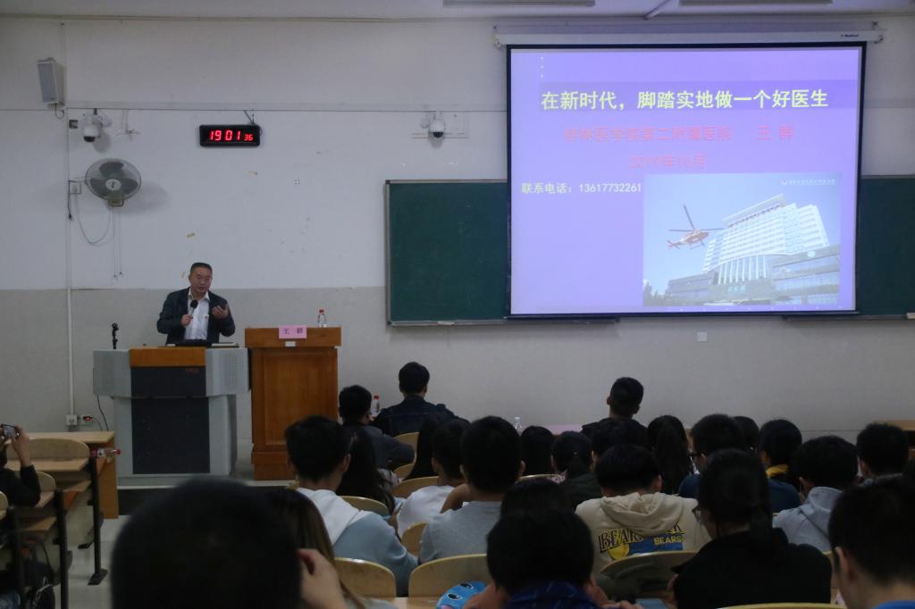 为进一步贯彻落实大学生导师制度,推进“三全育人”工作, 2019年10月23日,临桂临床医学院(全科医学院)在临桂校区教学南楼s103召开以“新时代,脚踏实地做一个好医生”为主题的导师交流会。2018级全科班全体学生及桂林医学院第二附属医院党委副书记、纪委书记、大学生导师王群出席本次交流会。