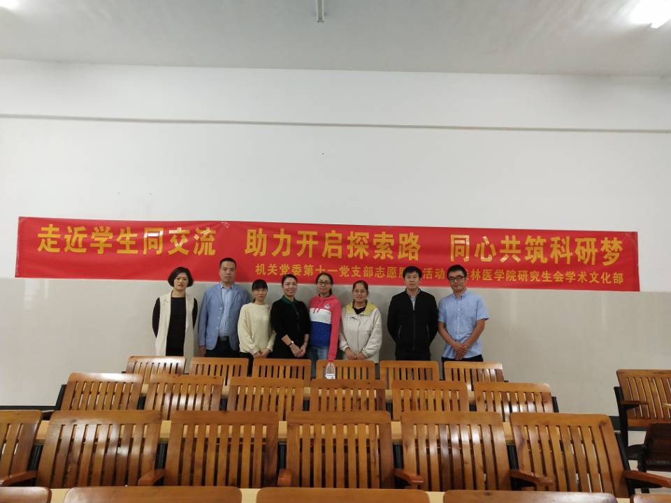 结合中共桂林医学院委员会关于开展“不忘初心、牢记使命”主题教育的实施方案,机关第十一党支部联合研究生学院、桂林医学院研究生会学术文化部面向全校研究生在教学南楼S208开展了主题为“走近学生同交流,助力开启探索路,同心共筑科研梦”的志愿服务活动。本次活动前期在研究生学院、研究生会学术文化部协助下面向桂林医学院全体研究生征集了关于细胞培养、细胞成像、流式细胞术及动物实验等医学相关常用实验方法和技术操作相关的问题,活动现场围绕这些问题进行答疑及深入交流。