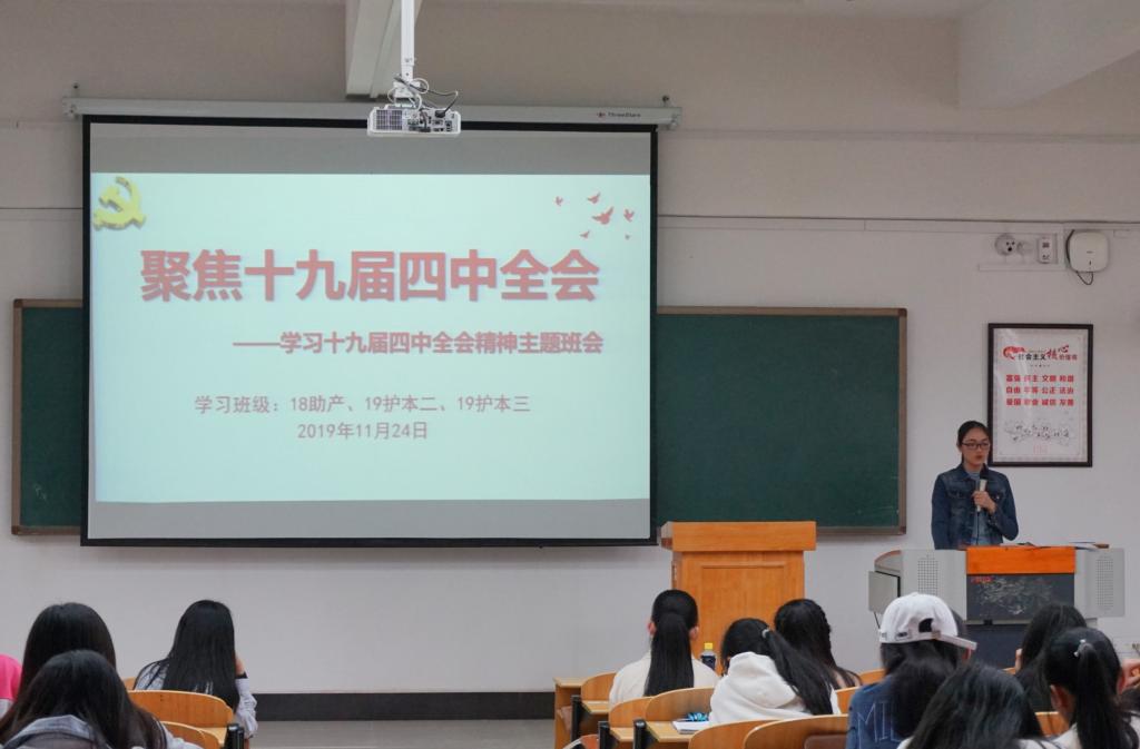 为认真学习贯彻党的十九届四中全会精神,进一步加强大学生的思想政治教育,11月24日下午,18助产班、19护本二班、19护本三班于临桂校区N402教室举行了“聚焦十九届四中全会”的学习主题班会。辅导员戴静娱与18助产班、19护本二班、19护本三班全体同学参加了此次主题班会。