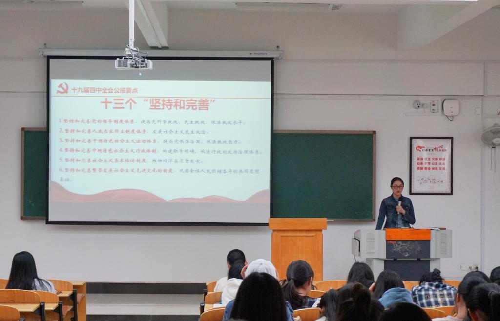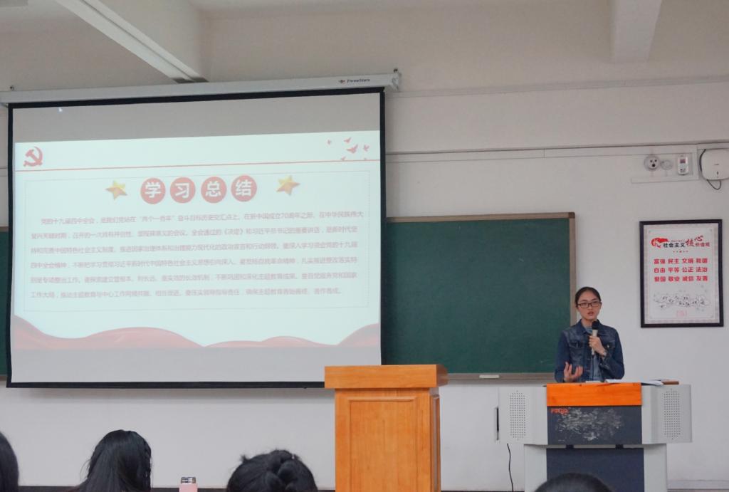 本次主题班会由辅导员戴静娱老师主持并领学党的十九届四中全会精神。戴老师分别从十九届四中全会概况、关于《决定》的说明、权威解读十九届四中全会、学习十九届四中全会资料推荐等几方面向同学们详细解读了党的十九届四中全会精神实质。在班会之前,有些同学对于学习十九届四中全会精神存在这样的困惑:感觉跟学习政治课的理论知识没有什么区别。针对学生的困惑,戴老师在领学时分享了自己的学习心得:学习十九届四中全会内容并不仅仅是学习政治知识,而是从更高的层面去看待国家建设和国家治理问题,我们要用一种历史观去审视新时代中国特色社会主义建设的辩证法和方法论,并且将这种方法论运用到实际生活中去。