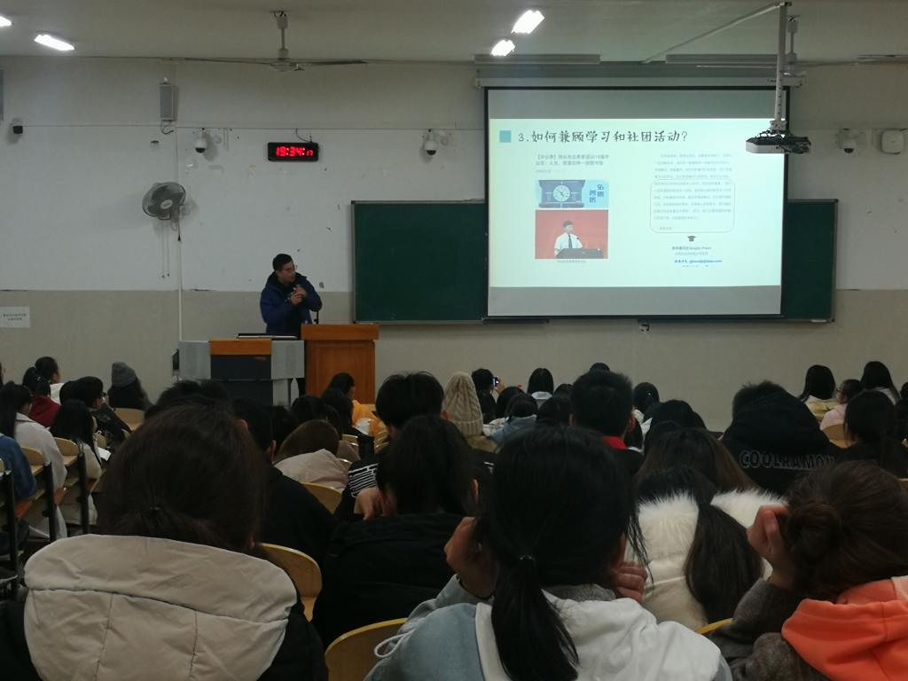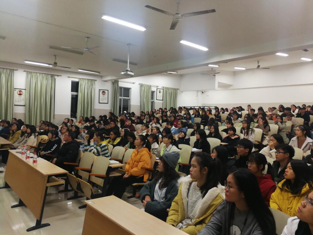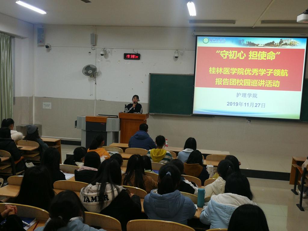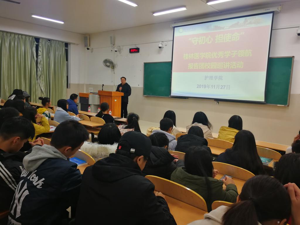 11月27日晚,在临桂校区教学南楼203教室,护理学院开展“守初心、担使命”优秀学子领航报告团校园巡讲活动。护理学院党委副书记唐小平、学工办副主任戴静娱、领航报告团成员蓝慧茹和张硕、以及护理学院200多名新生参加了巡讲活动。