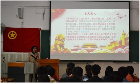 团课紧紧围绕“中国共产党第十九届四中全会”内容,阐述 “十九届四中全会的主题”“坚持和完善十三个方面制度体系”“十三个显著优势”和“九个新提法”,对中共中央作出的关于坚持和完善中国特色社会主义制度、推进国家治理体系和治理能力现代化的若干问题进行传达宣讲。莫丽琴要求全体学生干部认真学习贯彻落实党的十九届四中全会精神,与“不忘初心、牢记使命”主题教育紧密结合起来,推动全会精神落地落实。