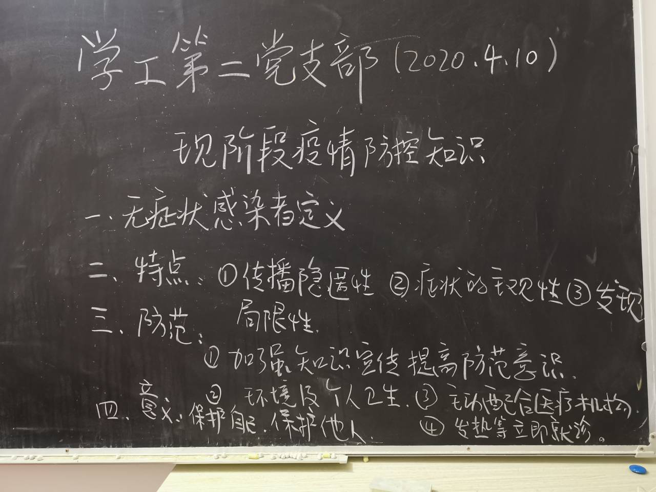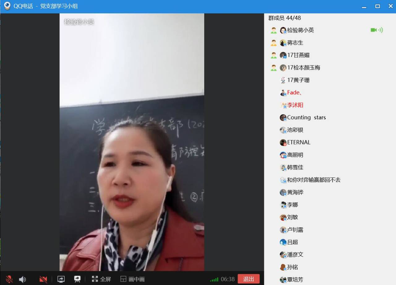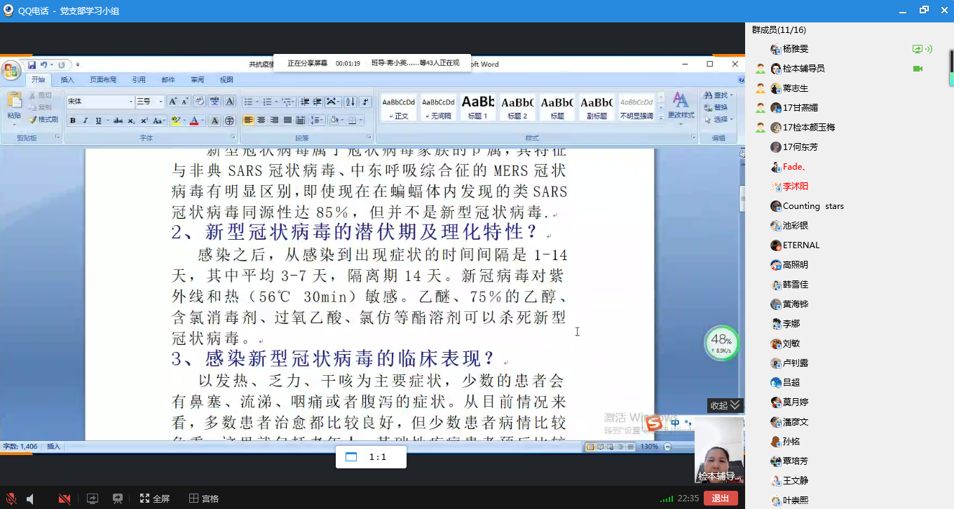 会议伊始,蒋小英就什么是新型冠状病毒肺炎无症状感染者、是否具有传染性以及如何防范等方面与党员进行了学习,蒋小英强调虽然目前疫情在国内得到了有效控制,但仍然不能松懈对病毒感染的防范,作为一名党员更加应该有意识的去保护自己、有责任去保护他人,同时提醒每个党员应该在国家需要的时候挺身而出,做好先锋模范。最后会议转接给党员杨雅雯主持,杨雅雯主要和党员们学习了新型冠状病毒肺炎的定义、潜伏期及理化特性、临床表现等内容,同时传达了关于疫情期间传播虚假谣言、起哄闹事等需要承担的相关法律责任,作为一名党员,我们应该坚决不信谣不传谣。