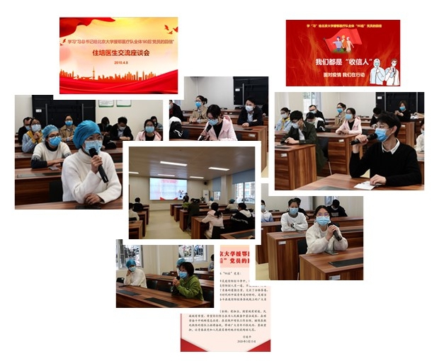 继续教育管理科4月8日下午组织部分住培医生党员和住培医生代表进行了现场的专题学习和讨论,鼓励大家担当奉献。广大住培医生们大受鼓舞,纷纷表示虽然肩上的担子沉甸甸,但是这份责任也是光荣的。“我们会沿着老师们的脚印,一步步前行,去践行‘健康所系,性命相托’的誓言”。