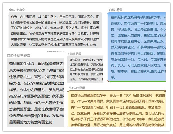 “虽然无法前往武汉,但是守住每一道党和人民交给的防线,用我们的青春热血守护我们伟大的祖国,是我们应尽的责任和义务”、“穿着白大褂穿梭在患者与家属之间,他们的支持与配合给予了我工作源源不断的动力。作为新时代青年,我们应该用读书积蓄力量,用行动肩负责任,用过硬的本领来回应时代的挑战和责任担当”、“作为一名青年住培医生,虽然自己的能力还不够,不能到武汉抗疫的最前线,但可以选择坚守我们现有岗位,守护好普通病房里的人民群众。”......