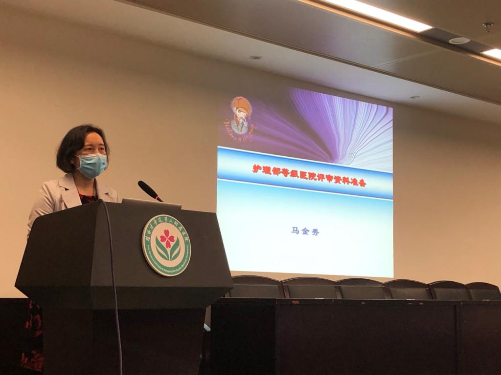护理部主任马金秀对三级综合医院评审标准中的基本概念和现场评审追踪检查的方法进行了解读,她针对护理有条款和无条款科室的创三甲工作都提出了相应要求,并就多学科协作方面对各部门提出了需求。