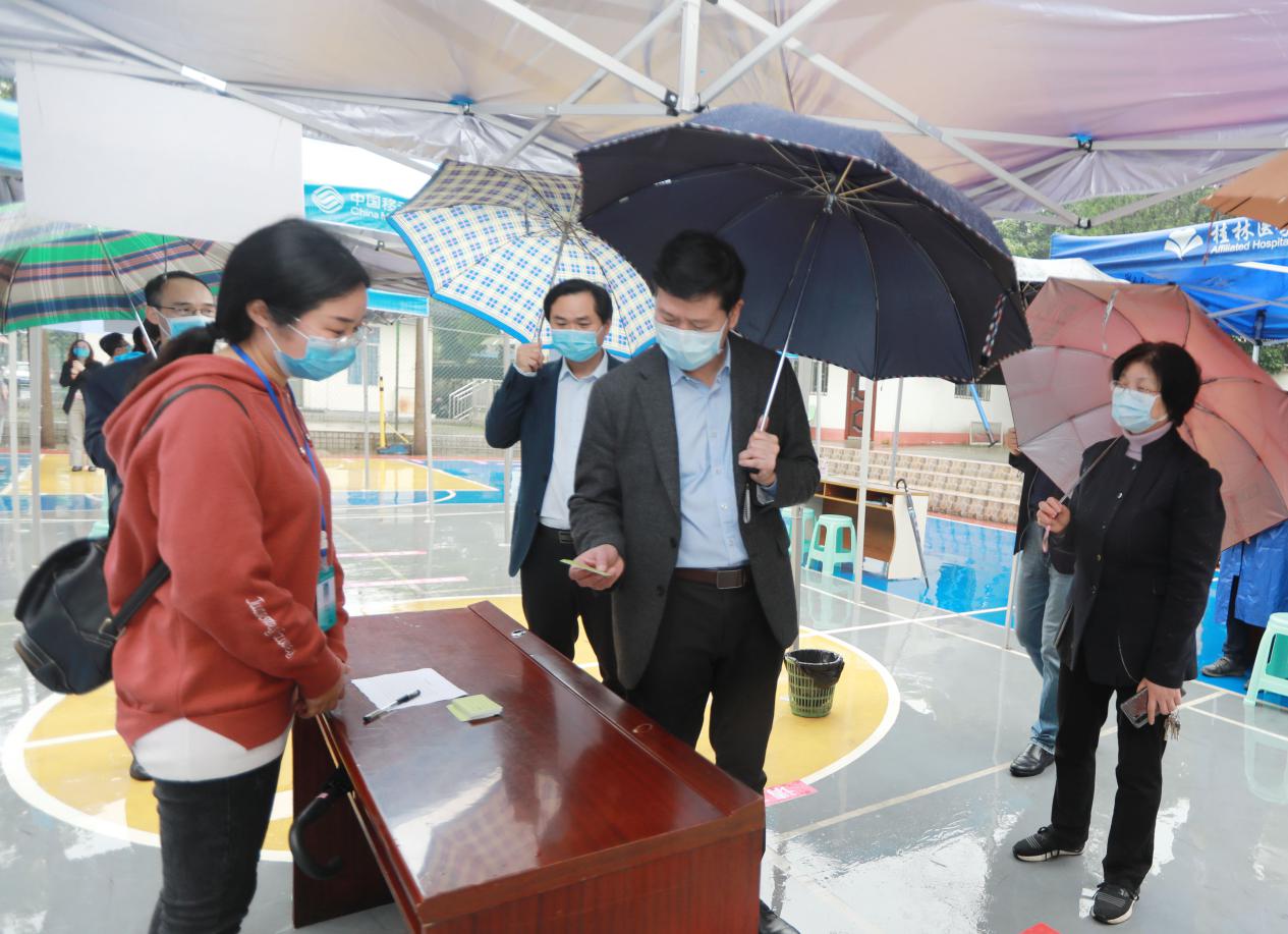 开学第一天,带着对返校学生安全的牵挂,桂林医学院院长张志勇,桂林医学院副院长辛懋、马献力,桂林医学院副院长、桂林医学院临床医学院/附属医院院长李清华,深入乐群校区详细了解临床医学院疫情期间学生返校报到流程、宿舍管理、就餐安全、应急预案、卫生消杀等工作。