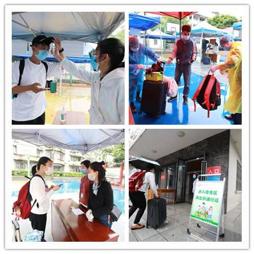 小编在现场看到,学生报道流程在乐群校区篮球场地进行。为了避免学生大量聚集,专门划分了安全间距,各项报到流程环节清晰。报到须进行体温检测,出示审批回执、广西健康卡码,并配合行李消毒、证件核验,持通行证到宿舍并登记,进出校园均持证出入。