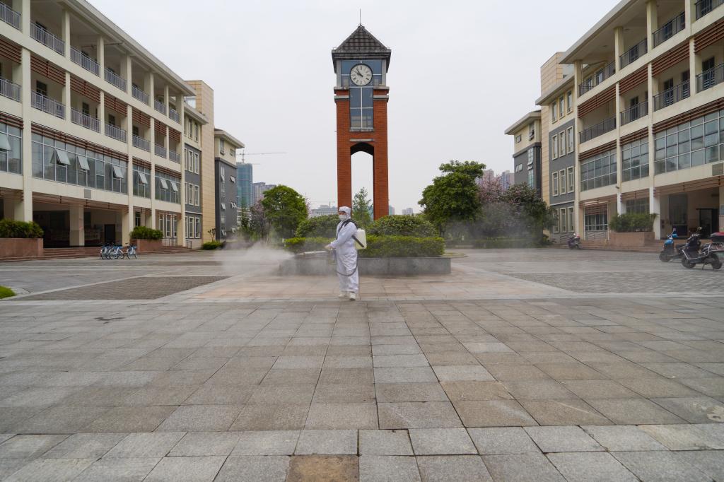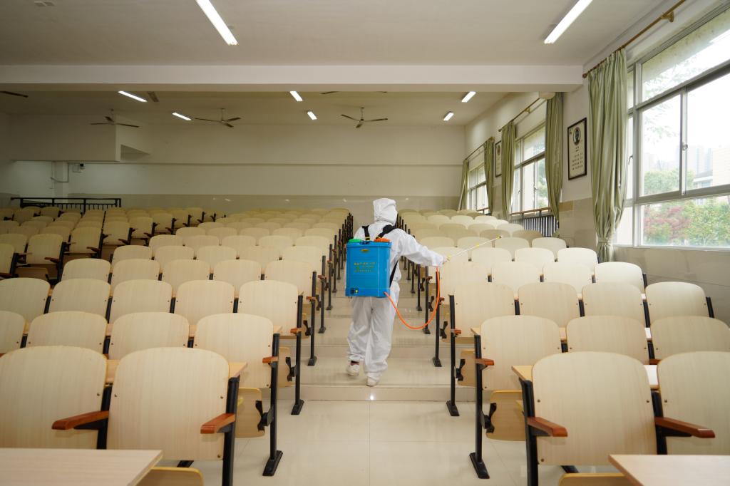 开学前,校园管理科对全校教室进行了消毒,负责各接待点的桌椅运送与摆放。学生返校后,另需负责对发热学生所在宿舍或教室进行终末消毒,对发热病人转移路线进行消毒。在学生解除健康观察后,需对观察室进行消毒。4月19日以来,共为50余间宿舍(观察室)进行了消毒。
