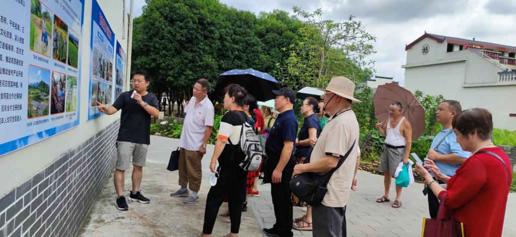 接着,老党员们参观了灵川县乡村风貌提升示范村——潭下镇山口村。走进村里,一栋栋白墙青瓦马头墙的桂北特色民居错落有致,干净整洁的水泥路穿村而过。党员们在讲解员带领下参观岭尾渡阻击战红色抗战文化遗址,学习桂北游击队革命先辈抗日救国的英勇事迹,党员们深感震撼与感动,在这里,大家重温入党誓词,纷纷表示一定要牢记革命历史,传承红色基因,发扬红色精神,充分发挥党员的模范带头作用。随后,大家参观了山口村村貌和村内的百年古树、千年名泉、三元及第等景观,深深感受到在我国乡村振兴政策下新农村面貌的巨大改变。山口村的风貌改造就是其中一个生动的实践典范,村民在党的领导下,充分挖掘文化底蕴,突出地方特色,大力发展乡村特色产业,谱写了乡村振兴新篇章。