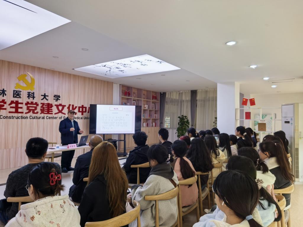 宿富国以“品味桂医故事,弘扬校训精神”为主题,将学校几经迁址、几易校名的发展史,一代又一代桂医人艰苦奋斗史,学校校徽、校训、校歌、校旗的来源和凝练过程,通过图片、故事的形式娓娓道来,鲜活地展现出学校深厚的历史底韵和强大的生命力,让在场师生深受感动与鼓舞,赢得师生的阵阵掌声。