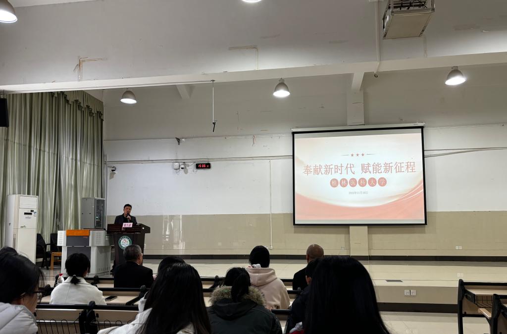 曾凡能围绕“奉献新时代,赋能新征程”主题,用学校老一辈教育工作者的感人事迹为例,阐释了新时代奉献精神的内涵,勉励青年学子要厚植家国情怀,练就过硬本领,以奋斗之我投身民族复兴伟业,让青春在服务祖国和人民中绽放光彩。