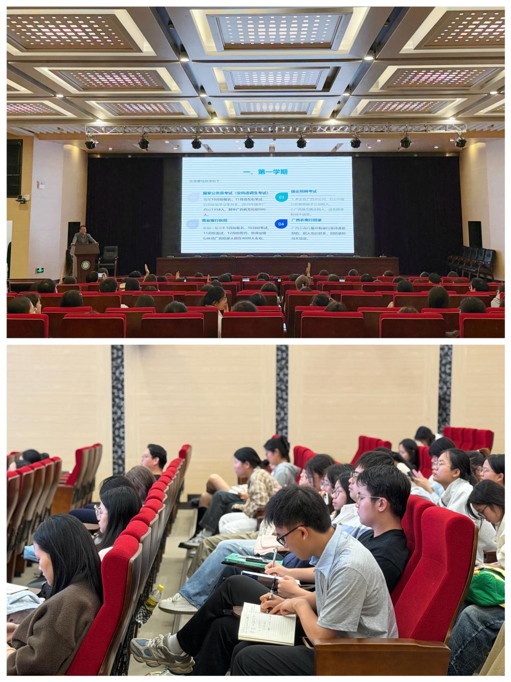 活动特邀公考行业资深就业指导专家主讲,围绕2027年国考岗位匹配、招录待遇、广西考情及行测申论备考技巧开展精准指导,紧密贴合我校学生专业与就业需求,务实解答学生备考疑问,有效补齐信息差。