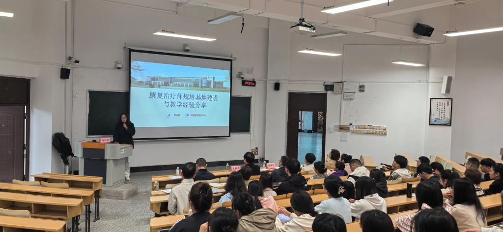 4 月 21 日下午,康复医学系特邀中国康复研究中心教育处处长乔柯姣、副研究员李洪霞开展交流授课活动,旨在提升学科建设水平,搭建与国内顶尖康复医院的合作桥梁。康复医学系主任王新涛、副主任王群、系部及第一附属医院康复医学科教师、2023级康复治疗学本科班学生到场聆听报告。