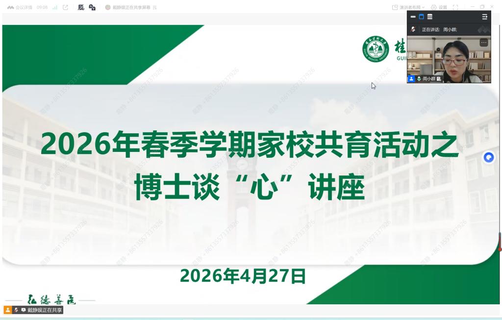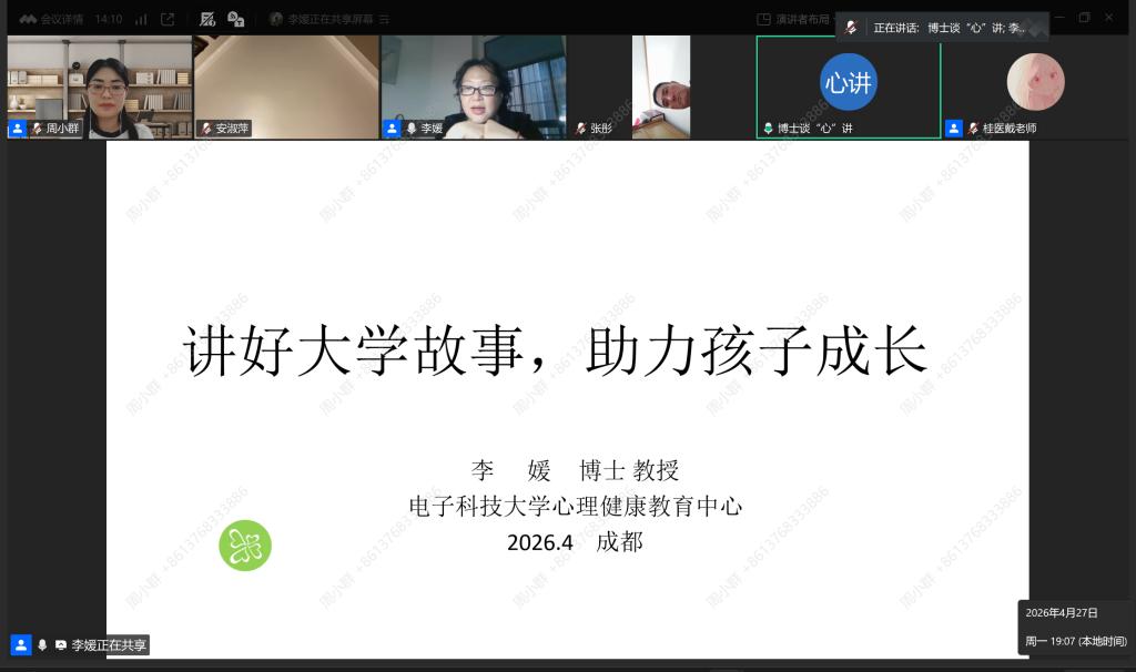 为深入贯彻国家心理健康教育工作部署,健全家校社医协同育人机制,4月27日晚,学生工作部(处)主办的2026年春季学期家校共育活动之“博士谈‘心’”专题讲座顺利开讲。电子科技大学心理教育中心首席教授李媛以“讲好大学故事,助力孩子成长”为主题,为我校大学生家长开展线上专题分享。