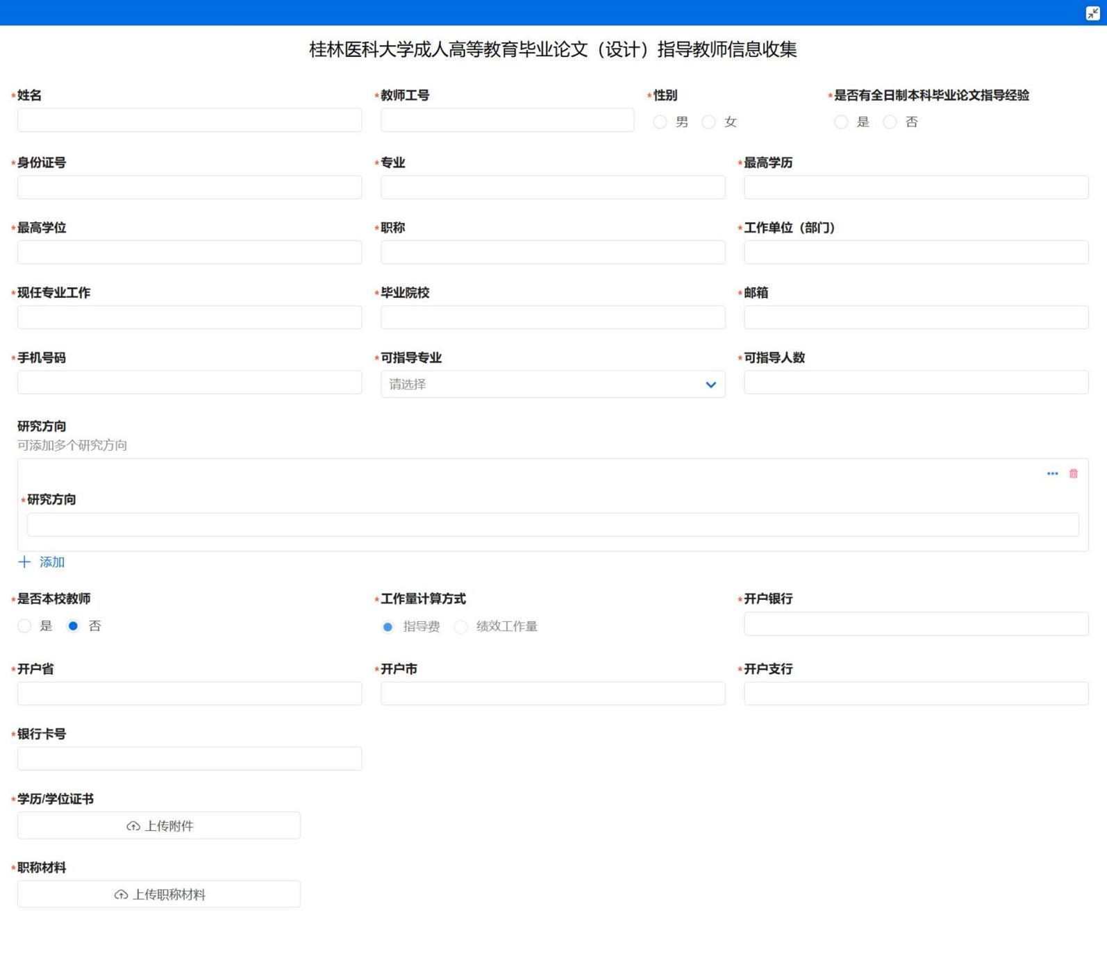 1.本人自愿申请,在线填写桂林医科大学成人高等教育毕业论文(设计)指导教师信息收集表(格式内容见图片)。