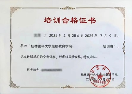经过程性考核合格,自治区级专业技术人员继续教育基地--桂林医科大学颁发。 |
