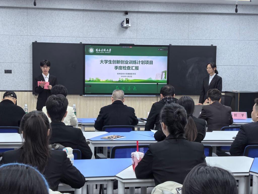 为加强项目管理,提升学生创新创业与实践能力,12月2日晚,康复医学系在东城校区科教楼203多功能智慧实训室举办2025年度大学生创新创业训练计划项目季度汇报会。系主任王新涛、副主任王群、第一附属医院康复医学科主任陈莹等9位专家担任评委,13个项目参与汇报,线上线下200余名师生观摩。