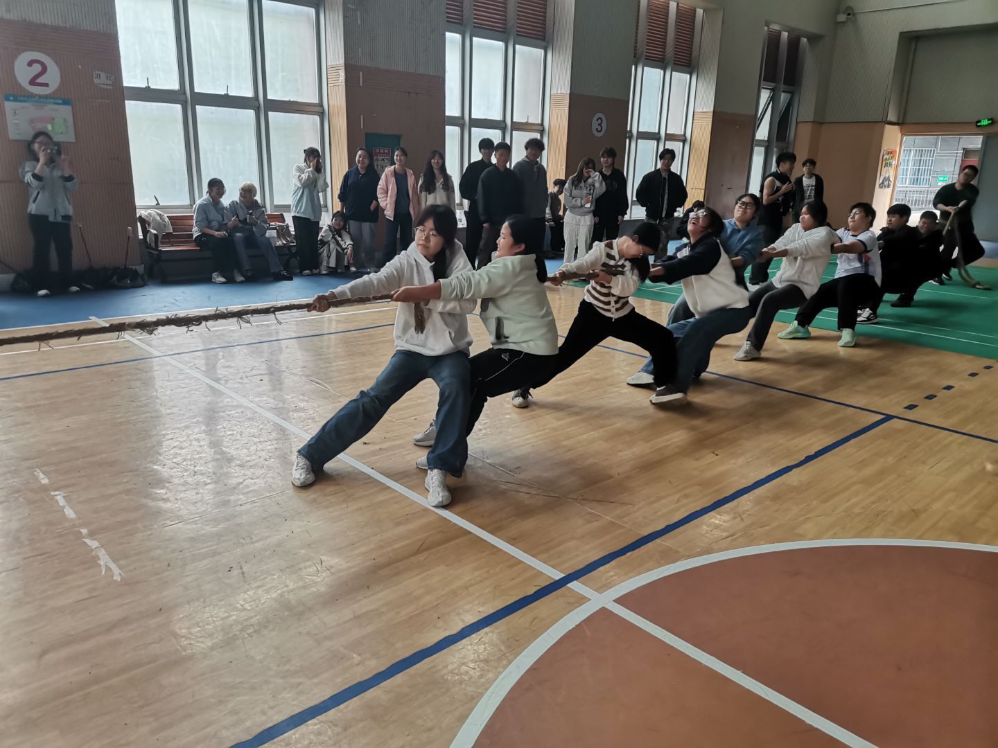 3月22日下午,拔河比赛在临桂校区大学生活动中心篮球场燃情开赛,2025级6支代表队展开力量与意志的较量。伴随清脆的哨响,队员们紧握长绳,压低重心,倾全力于一绳。场外加油声、欢呼声震耳欲聋,将比赛氛围推向顶点。