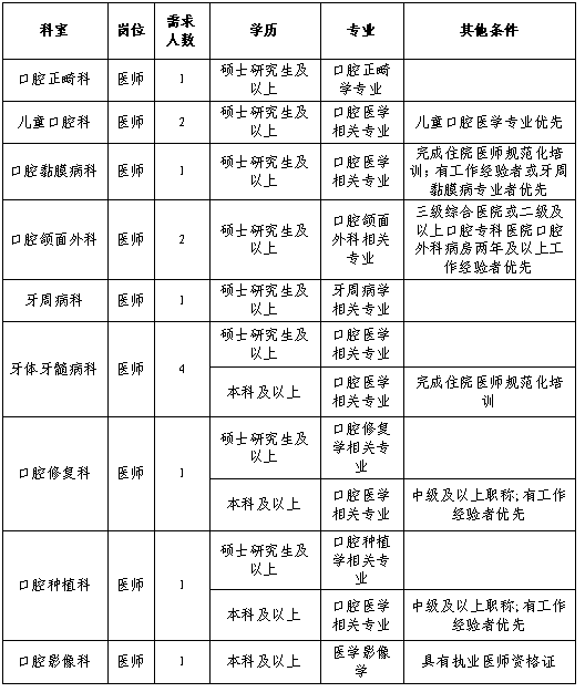 根据医院发展需要,我院现面向社会公开招聘口腔医师,具体事宜如下: