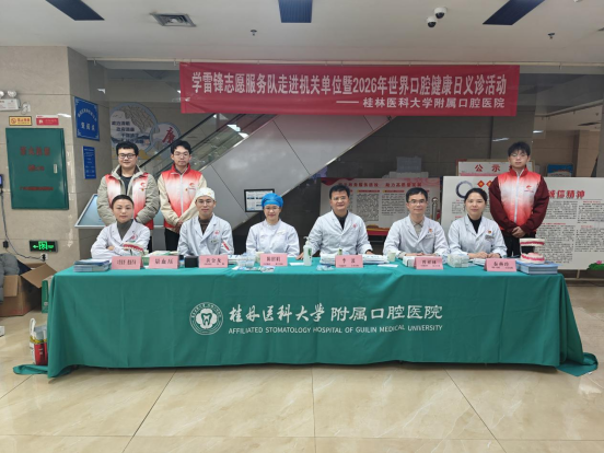 为弘扬新时代雷锋精神,在第63个“学雷锋纪念日”、3·20“世界口腔健康日”到来之际,3月5日-6日,桂林医科大学附属口腔医院(口腔医学院)党委切实发挥党建引领作用,通过党建带团建,将学习雷锋精神融入日常、落到实处,组织医疗服务队和党员、团员志愿者走进桂林市机关单位开展学雷锋志愿服务暨2026年世界口腔健康日党建联建口腔义诊科普活动,通过“健康服务+志愿服务”,提高公众对口腔健康的重视,普及口腔健康知识,同时激励医院党员干部充分发挥专业优势,立足岗位作贡献。