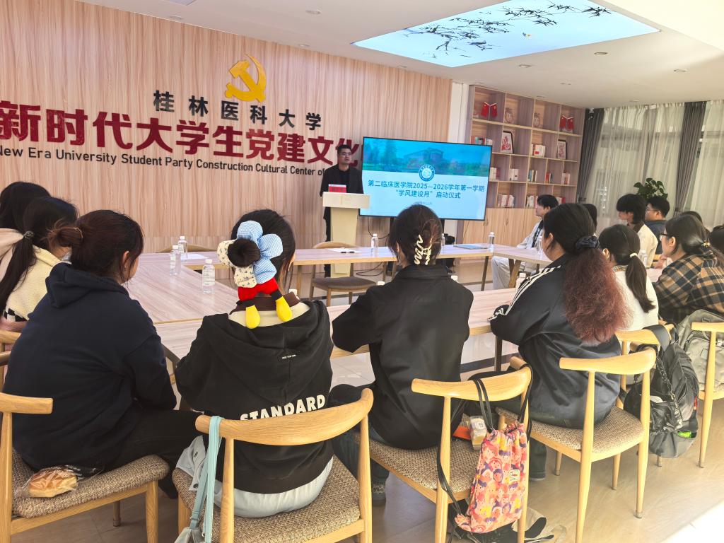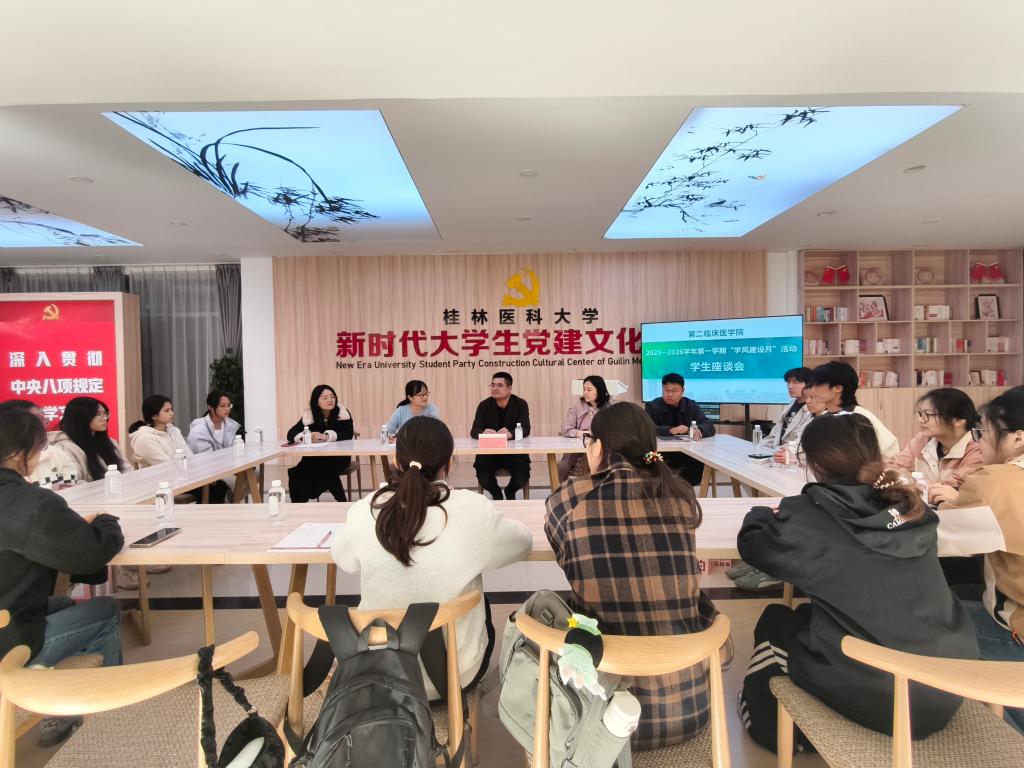为持续优化学风生态,营造奋发向上的育人氛围,2025年12月2日下午,第二临床医学院在临桂校区大学生党建文化中心召开2025-2026学年第一学期“学风建设月”启动仪式暨学风建设座谈会。第二附属医院(第二临床医学院)党委副书记黄宇平、全体辅导员以及各年级学生代表共同参加会议,这也是为期一个多月的学风建设系列活动进入深化推进阶段。
