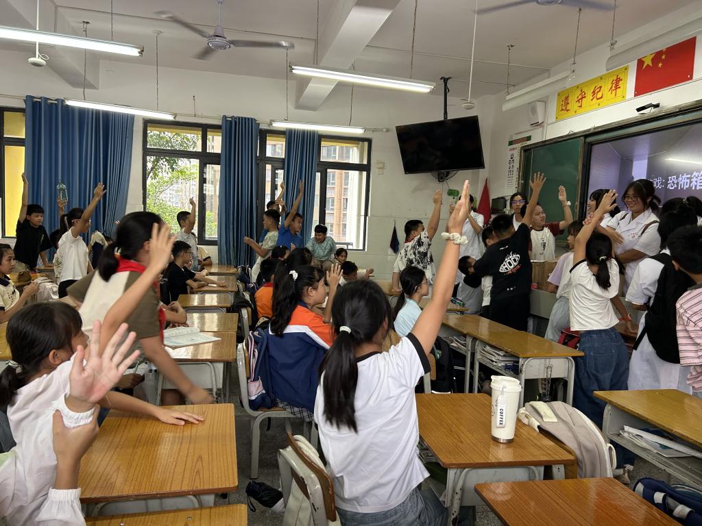 师生宣讲员以我国首颗原子弹研制的艰辛历程为切入点,用通俗易懂的语言,生动讲述了彭士禄隐姓埋名投身核潜艇研究、王承书为核事业毅然放弃个人学术前途等先辈的感人事迹,还组织小学生观看纪录片《核护初心》的精彩片段。宣讲全程以“历史脉络+精神解读”为框架,特别设计“两弹一星知多少”互动问答环节,将抽象的精神内涵转化为具象场景,既高效传递知识,更点燃了孩子们的爱国热情。