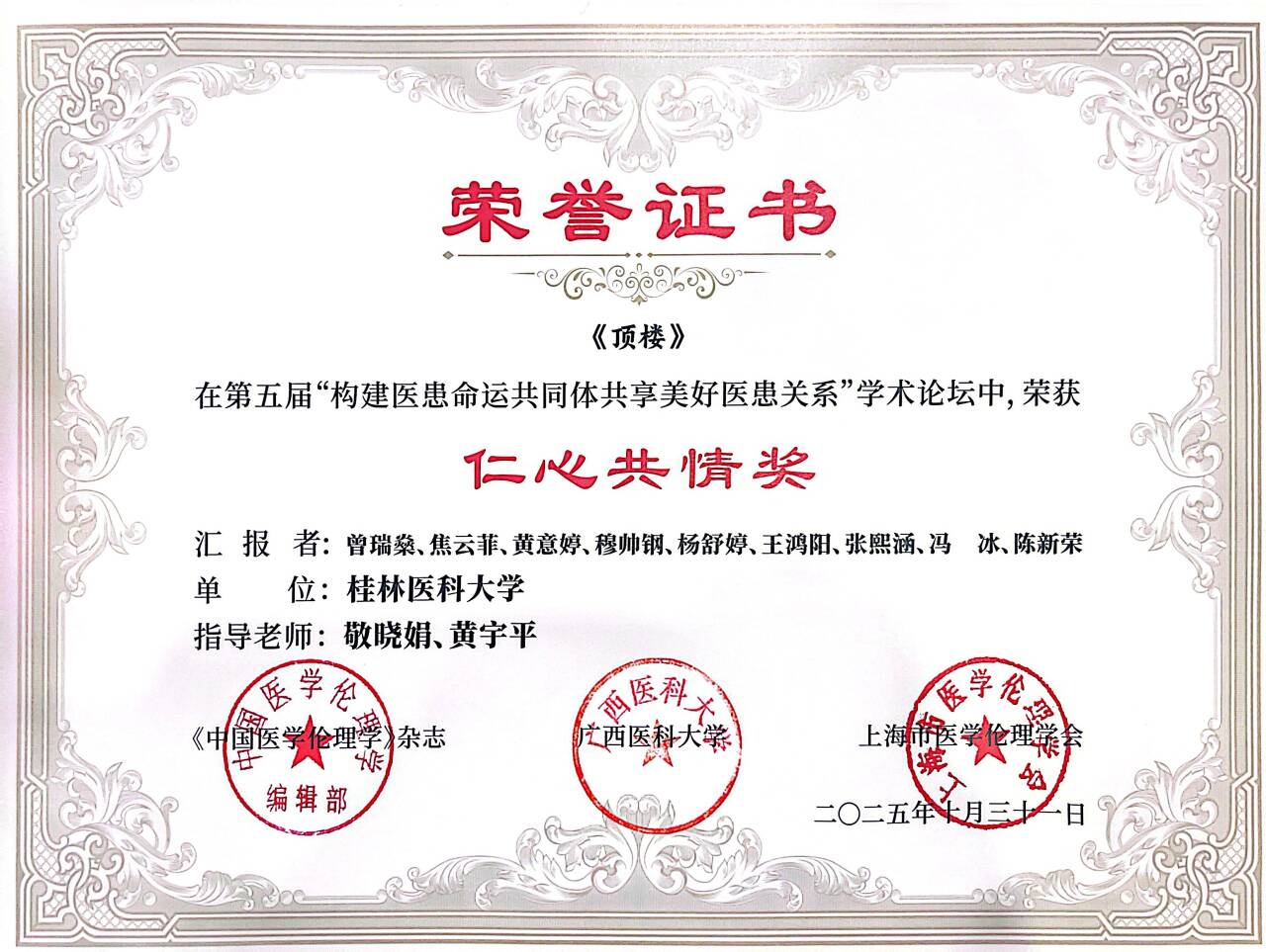 活动当晚,来自广西医科大学、空军军医大学、新疆医科大学、西安医学院、桂林医科大学等多所高校的师生代表带来案例汇报、情景剧、微电影等不同形式的分享,展现医学人文教育的实践成果与深刻思考。其中,我校原创情景剧《顶楼》以真实细腻的叙事和真挚动人的表演,让不少观众感动落泪,赢得了现场嘉宾的高度评价,最终获评“仁心共情奖”。哈尔滨医科大学医学伦理学研究所所长尹梅在点评时提到,《顶楼》生动呈现了医护人员为挽救一名患病女孩所付出的不懈努力,让她和在场的许多人都深受触动,包括很多医生在现场心都被揪起来了。