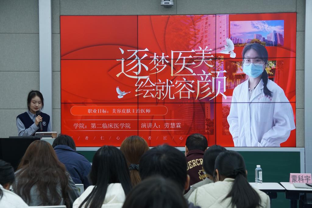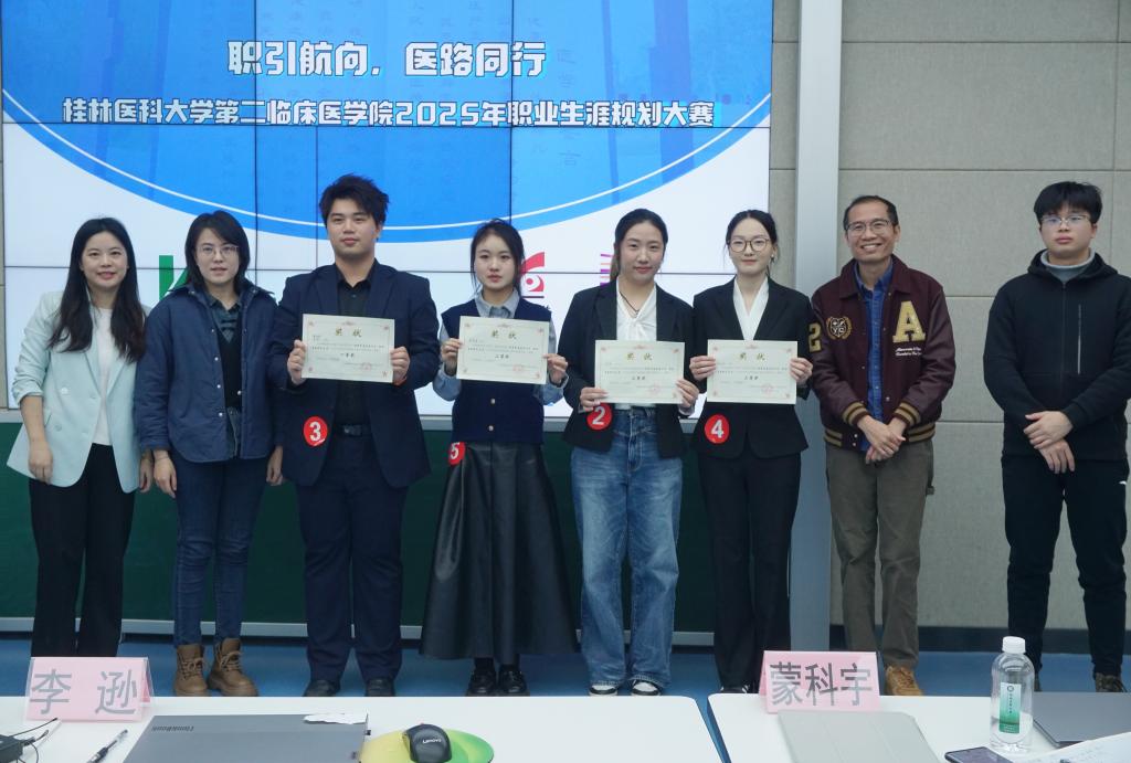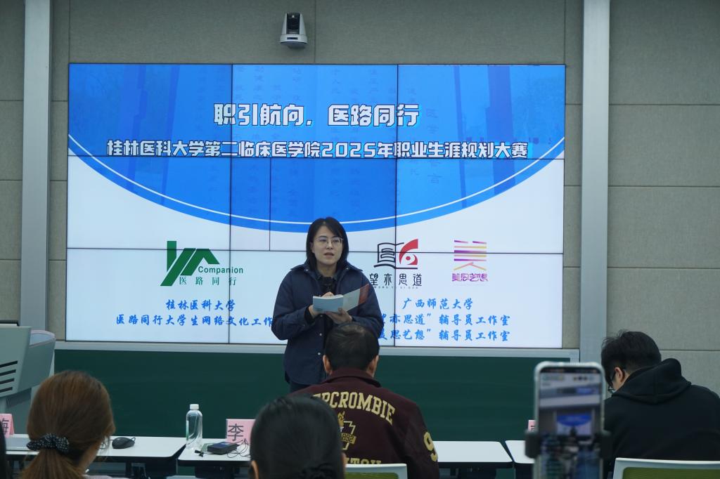 为推动高校生涯教育与就业指导工作走深走实,进一步增强大学生职业规划意识,引导学生树立科学择业观,提前谋划就业路径,促进高质量充分就业,11月23日上午,第二临床医学院在临桂校区教学北楼N412教室举办以“职引航向,医路同行”为主题的大学生职业生涯规划大赛。活动通过第二临床医学院官方抖音账号同步直播。