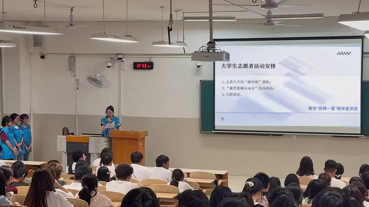为推动后续志愿服务活动顺利进行,9月28日晚上,菁华志愿服务团面向2025级第二临床医学本科一、二班学生,在临桂校区教学南楼S202开展了一场“两弹一星”主题志愿服务培训,围绕“碳中和”主题宣讲相关工作进行全面部署与能力提升指导。