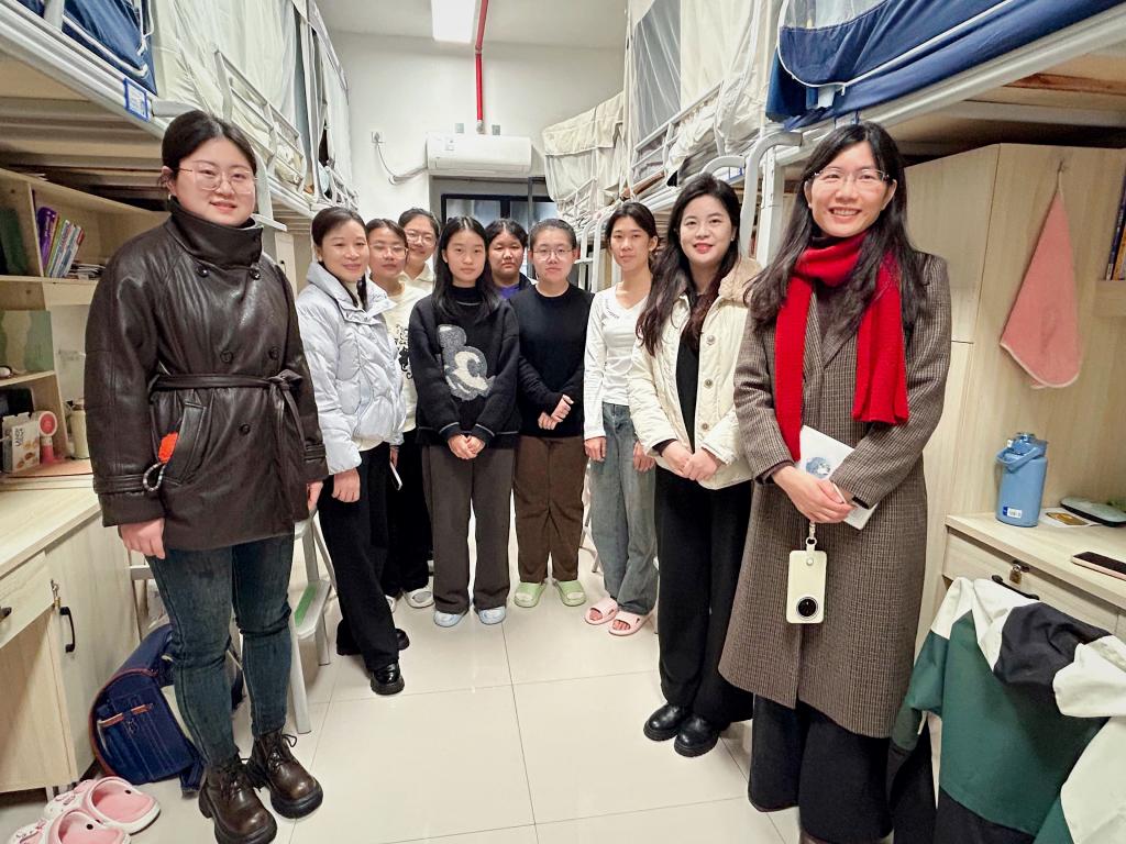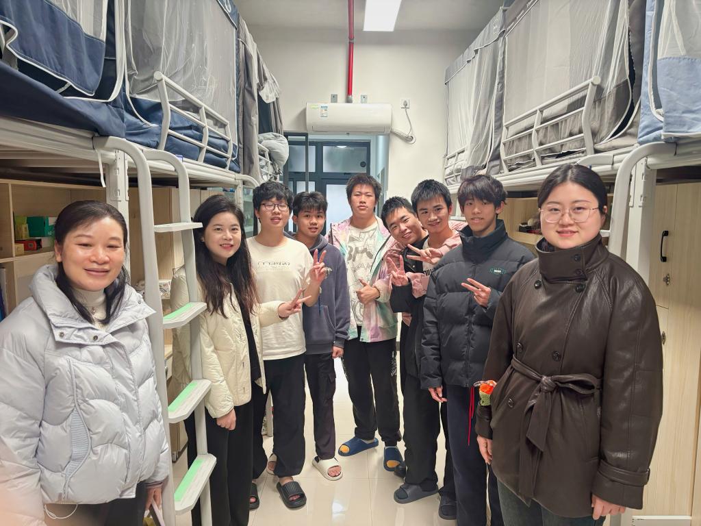 为近距离了解学生学习状态与实际困难,及时提供学业指导与心理支持,2025年12月23日下午,新生班级大学生导师高露萍、辛敏,辅导员敬晓娟,班主任植懿丹一同走进临桂校区学生宿舍楼,开展暖心走访活动。
