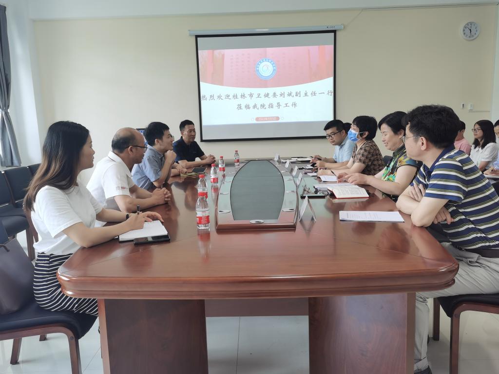 2022年7月5日,桂林市卫生健康委员会刘斌副主任一行5人到全科医学院就定向免费医学生进行考察调研,全科医学院党委书记马明霞、院长郑楚、党委副书记潘涛、副院长尹凯、专职组织员周长春及全体教职工参加此次座谈会。